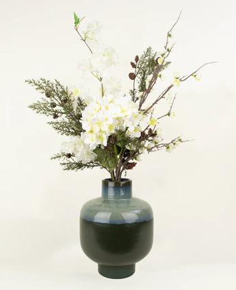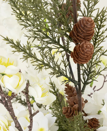 Rustique, naturel et doux - le bouquet de soie terrestre apporte la beauté sereine d'un paysage forestier paisible. Avec un nouveau mélange de branches de pin vert, de délicates épanouissements de cerisier blancs et de crème douce, ce bouquet crée une atmosphère calme et harmonieuse qui invite à la relaxation.