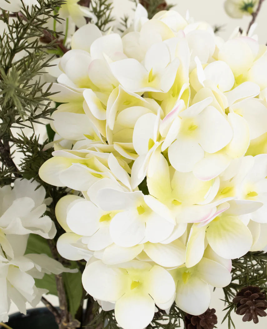Les aiguilles de pin dans différentes longueurs forment une base ludique et naturelle, tandis que la fleur de cerisier japonaise et de soie attrape l'élégance légère et la splendeur fragile du printemps. La vraie touche Hortensia en crème ajoute une touche chaleureuse et complète...