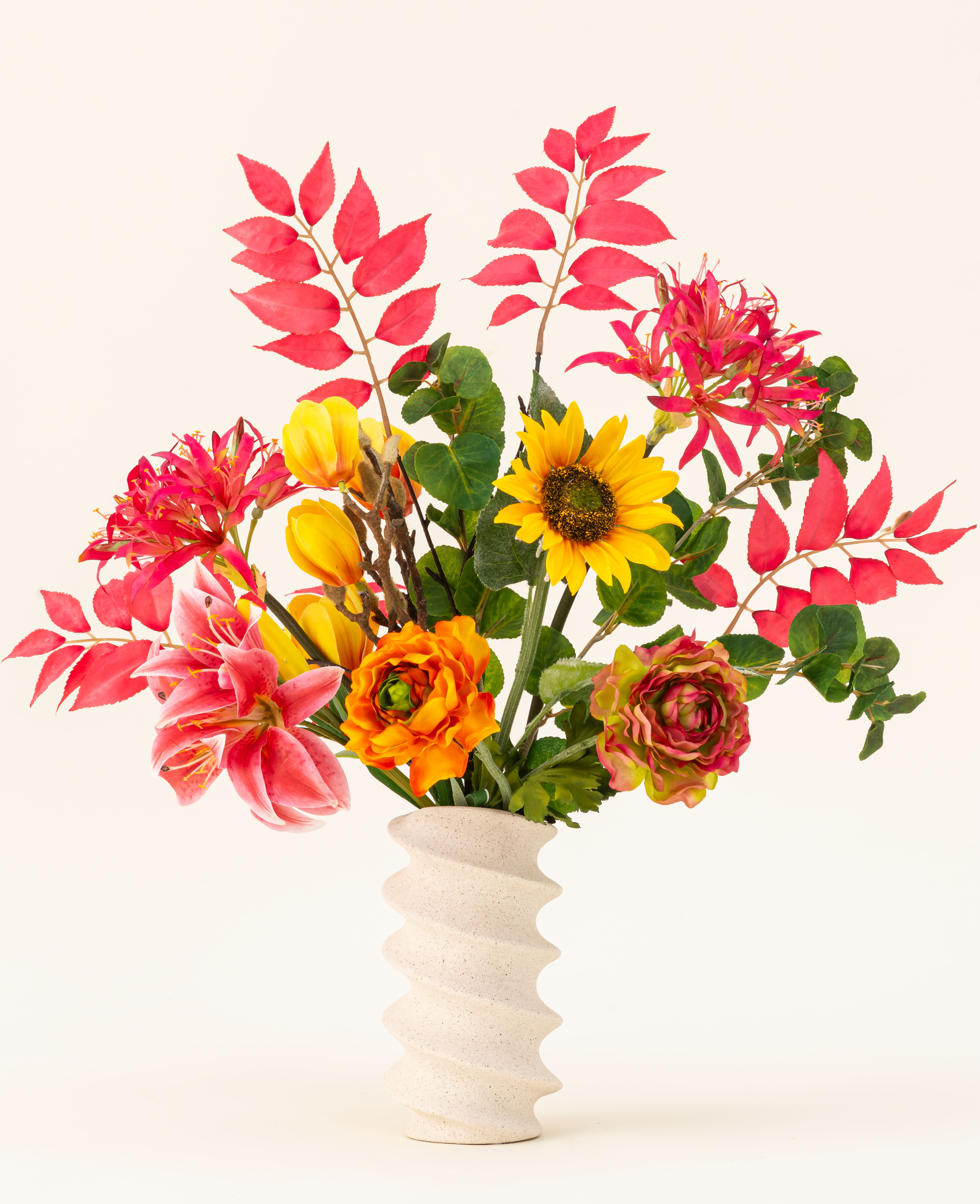 Floral Funn est un bouquet de soie qui regorge de couleur, d'énergie et d'élégance ludique. Avec les tons fuchsia, jaune, vieux rose et vert chaud, cet arrangement rayonne la gaieté et la créativité. Parfait pour ceux qui aiment une déclaration colorée et un intérieur qui respire la positivité.