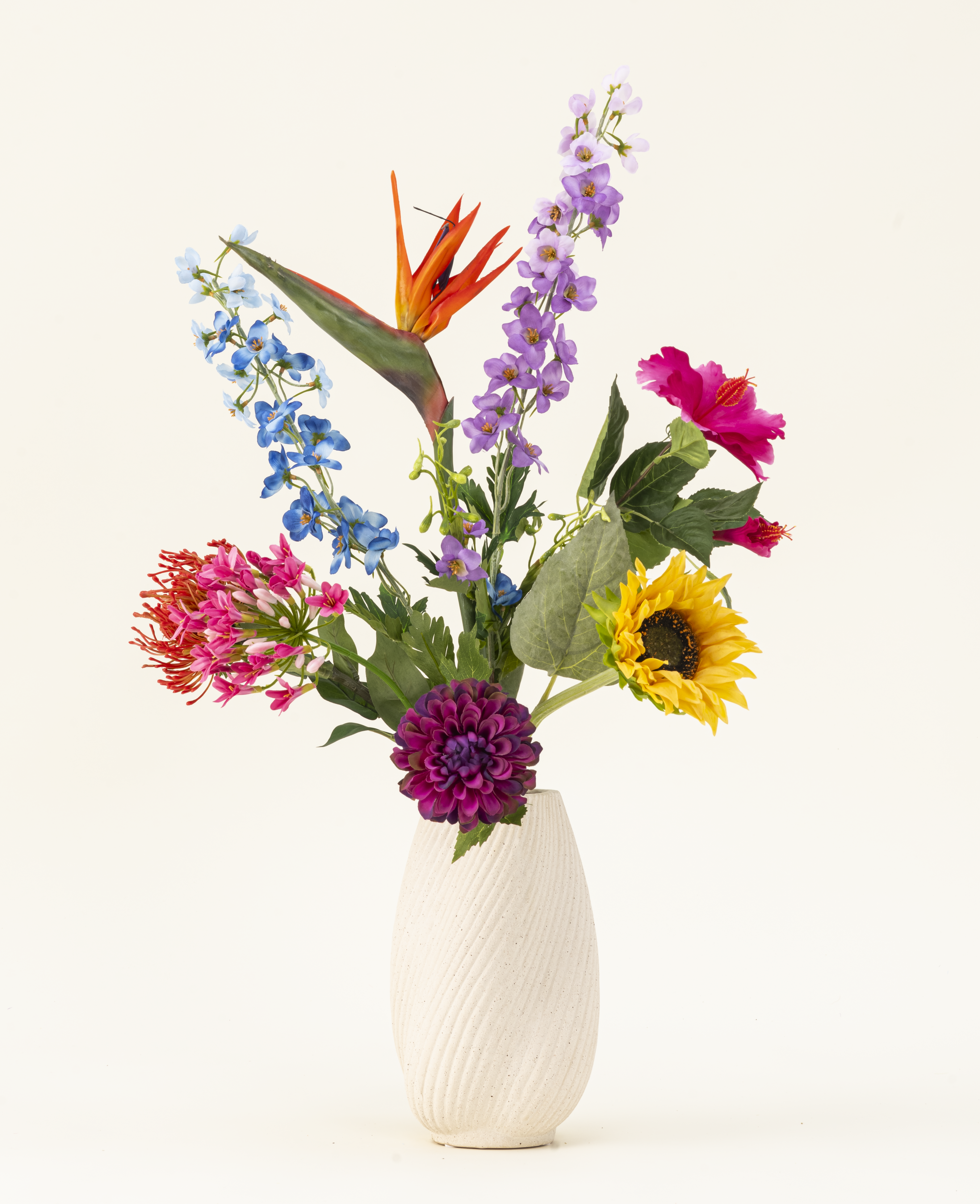 Le dahlia en violet, avec le Delphinium, forme une base élégante et verticale en violet et en bleu. L'hibiscus rose et l'agapanthus ajoutent une touche douce et romantique, tandis que la puissante protection et la strelitzia frappante en rouge / violet fournissent un bord exotique. Le...
