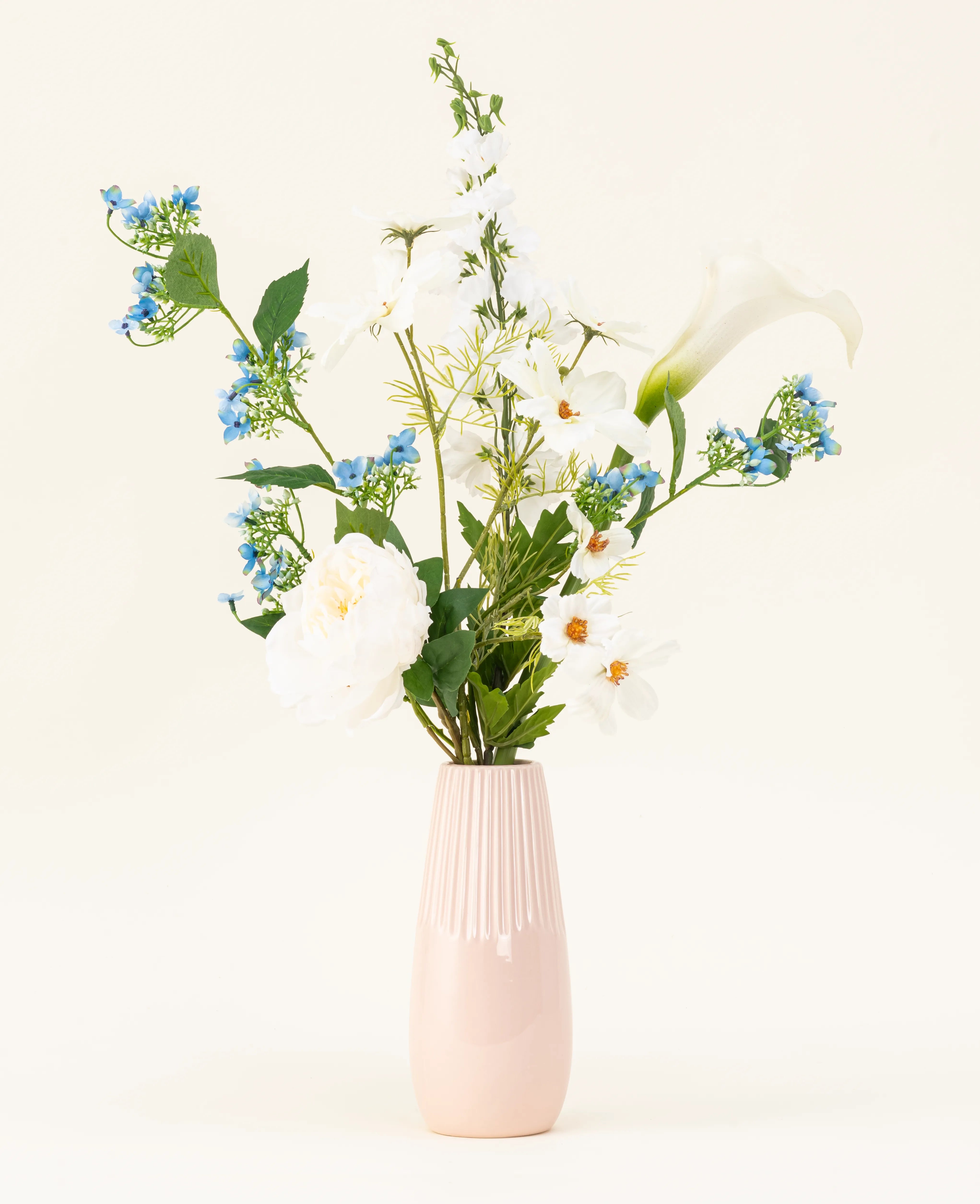 Les fleurs artificielles de lys tactiles ajoutent une élégance majestueuse, tandis que l'hortensia bleu sauvage offre un bouton de couleur enchanteresse qui donne toute la profondeur. Ensemble, ces fleurs artificielles créent un jeu harmonieux de douceur, de lumière et de raffinement.